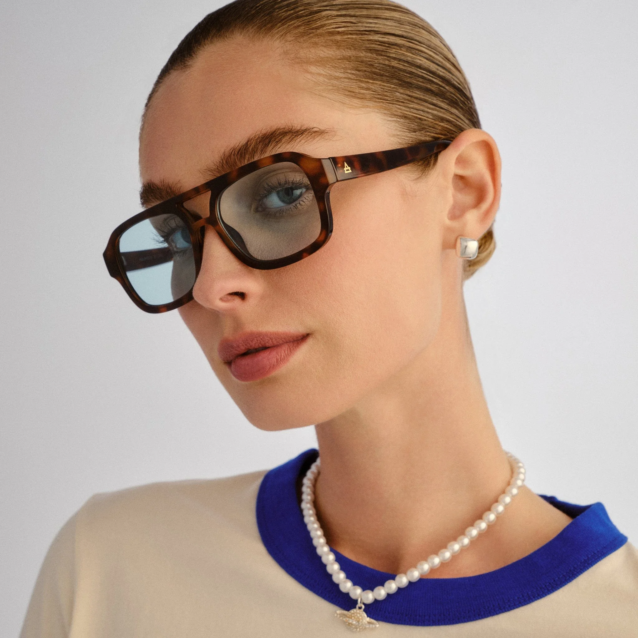 Close-up of a woman with styled blonde hair, wearing tortoiseshell sunglasses, a pearl necklace, and a cream and blue top, against a plain background.